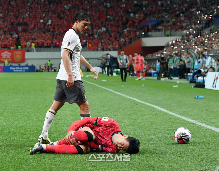 중국 축구대표팀의 양 쩌샹(위)가 11일 서월월드컵경기장에서 열린 월드컵 아시아 지역 예선 한국전에서 자신의 파울로 쓰러진 손흥민을 노려보고 있다. 2024. 6. 11.