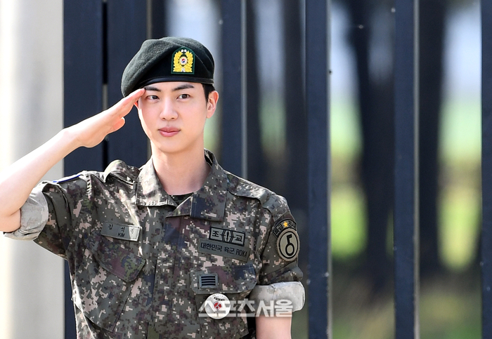 진은 지난 2022년 12월 13일 육군 현역으로 입대해 제5보병사단에서 신병교육대 조교로 복무했다. 전세계가 주목하는 월드스타지만 누구보다도 열정적으로, 복무에 임했다는 게 관계자의 전언이다.