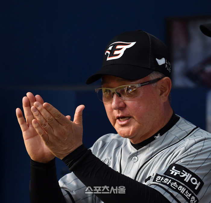 한화 김경문 감독이 12일 잠실구장에서 열린 2024 프로야구 두산베어스와 한화이글스의 경기 5회말 위기에서 2실점으로 막아내며 3-2 리드를 유지하자 선수들을 독려하고 있다. 2024.06.12.