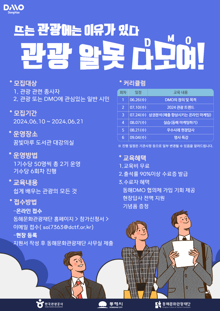 재단은 오는 6월 21일까지 수강생 50명을 모집, 관광 또는 DMO에 관심있는 일반 시민과 관광 관련 종사자, 문화관광해설사 등 누구나 가능하며 동해문화관광재단 홈페이지에서 신청하면 된다.