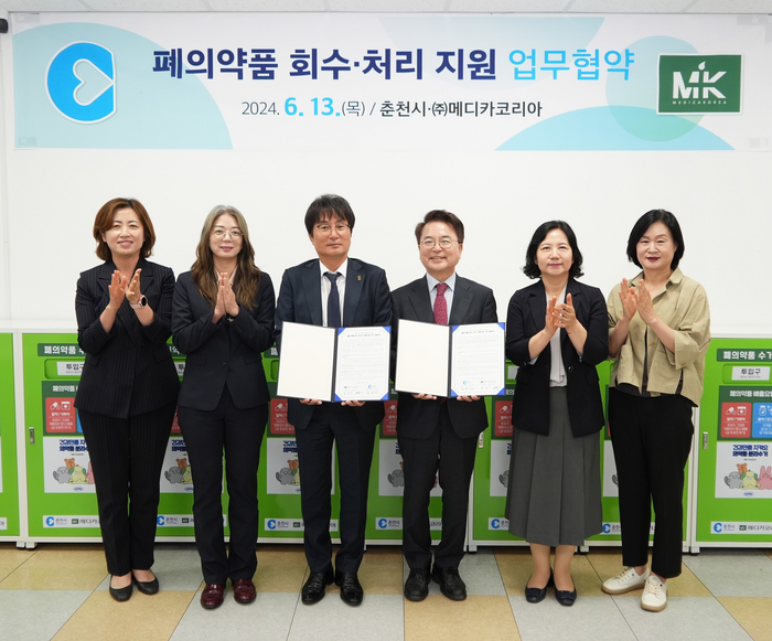 [스포츠서울ㅣ춘천=김기원기자] 육동한 춘천시장은 13일 오전 11시 40분 춘천남부노인복지관에서 ㈜메디카코리아(대표이사 육일수)와 가정 내 의약품의 올바른 사용과 폐의약품 회수·처리 지원 업무협약을 체결했다.