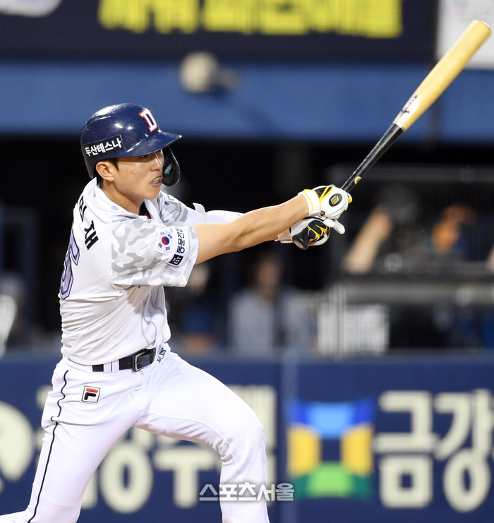 두산 베어스 전민재가 3일 잠실구장에서 열린 2024 KBO리그 한화 이글스와 경기 5회말 무사 3루 상황에서 한화 투수 장시환을 상대로 1타점 적시타를 치고 있다. 2024. 6. 13.