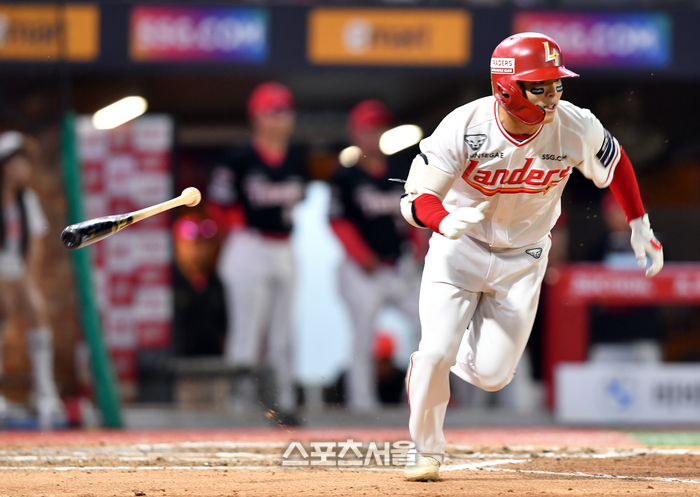 SSG 9번타자 정준재가 13일 인천SSG랜더스필드에서 열린 2024 프로야구 SSG랜더스와 KIA타이거즈 경기 6회말 1사 후 안타를 터트리고 있다. 2024.06.13.