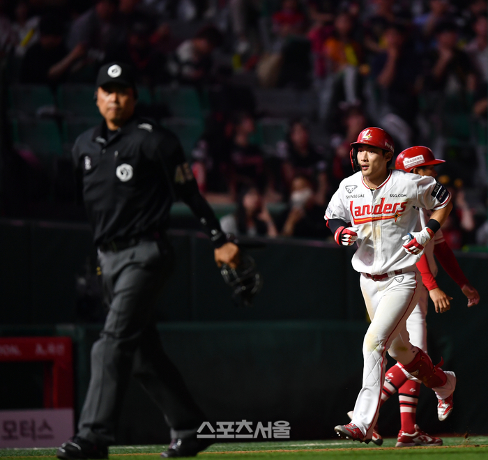 SSG 2번타자 최지훈이 13일 인천SSG랜더스필드에서 열린 2024 프로야구 SSG랜더스와 KIA타이거즈 경기 8회말 2사후 김도현을 상대로 우월 1점홈런을 터트리며 홈인하고 있다. 2024.06.13.