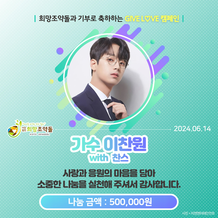 이번 기부는 이찬원이 K-POP 커뮤니티 플랫폼 ‘포도알’에서 트롯·스타덤 5월 투표에서 1위로 선정되며 이뤄졌다. 이번 기부금은 쪽방촌의 주거취약계층 어르신을 위한 여름 물품 지원에 사용될 예정이다.