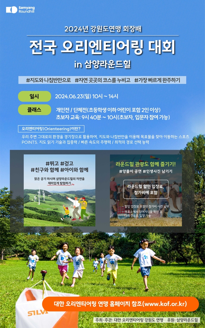 [스포츠서울ㅣ김기원기자] 평창군 대관령 삼양라운드힐(前 삼양목장)에서 오는 6월 23일(일) ‘2024 강원도 연맹 회장배 전국 오리엔티어링 대회’를 개최한다.