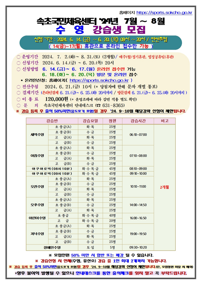 [스포츠서울ㅣ김기원기자] 속초국민체육센터는 6월14일~20일까지 ‘2024년 7~8월 수영강습생’을 모집한다.