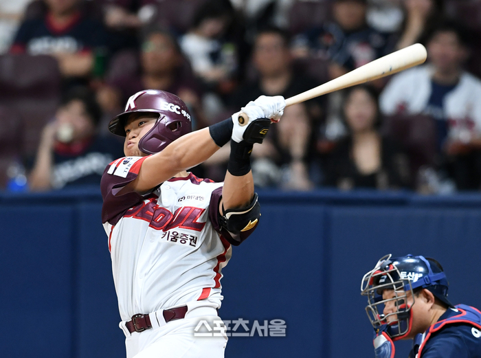 키움 히어로즈 김건희가 16일 고척스카이돔에서 열린 2024 KBO리그 두산 베어스와 경기 5회말 무사 만루 상화에서 두산 투수 김강률을 상대로 2타점 적시타를 치고 있다. 2024. 6. 16.