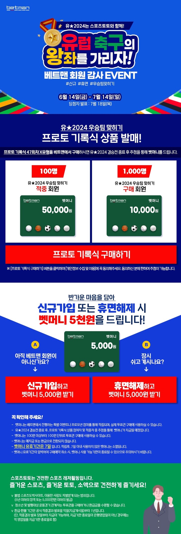 지난 14일부터 오는 7월14일까지 진행하는 ‘유럽 축구의 왕좌를 가리자!’는 ‘유로 2024’의 개최를 맞이하여, 베트맨 신규 가입자 혹은 휴면 해제 회원들을 위해 마련한 감사 이벤트다.