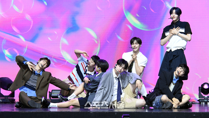 이븐(EVNNE)이 17일 서울 광진구 예스24 라이브홀에서 진행된 세 번째 미니 앨범 ‘RIDE OR DIE’ 발매 기념 미디어 쇼케이스에서 앨범 수록곡 무대를 선보이고 있다. 2024. 6. 17.