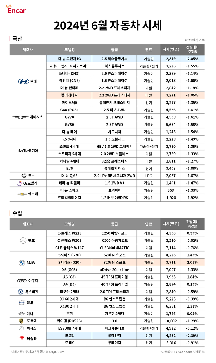 [스포츠서울 | 배우근 기자] 엔카닷컴(대표 김상범)의 6월 중고차 시세에 따르면 국산차와 수입차 대표 모델의 전체 평균 시세가 0.85% 하락했다. 약보합세다.