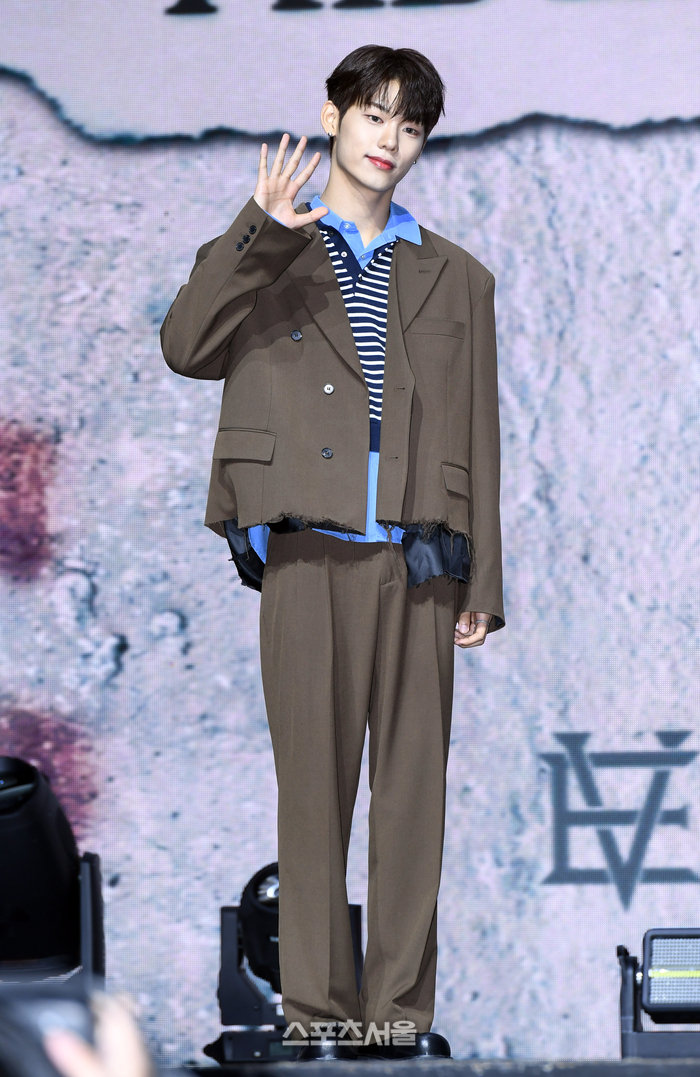 이븐(EVNNE)의 이정현이 17일 서울 광진구 예스24 라이브홀에서 진행된 세 번째 미니 앨범 ‘RIDE OR DIE’ 발매 기념 미디어 쇼케이스에서 취재진을 향해 포즈를 취하고 있다. 2024. 6. 17.