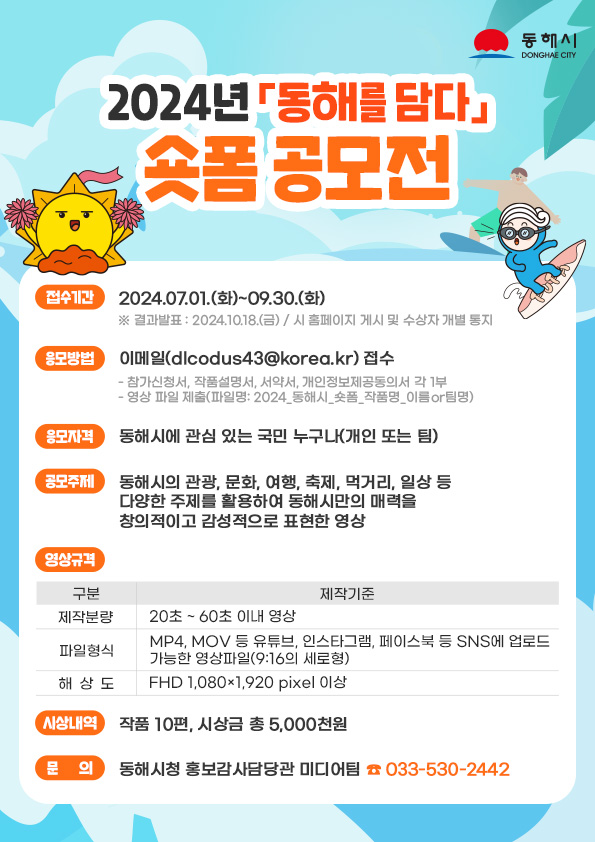 [스포츠서울ㅣ김기원기자]동해시(시장 심규언)가 참신하고 개성 있는 홍보 콘텐츠 발굴을 위해 2024년 「동해를 담다」 숏폼 공모전을 개최하여 관심을 모으고 있다.