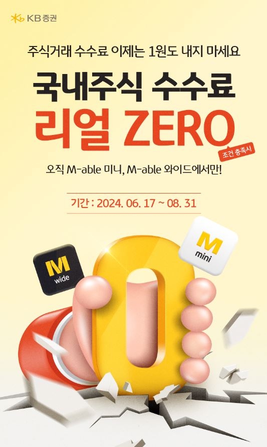 [스포츠서울 | 최규리 기자] KB증권은 ‘M-able 미니’ 또는 ‘M-able 와이드’를 통해 주식 거래하는 고객(비대면, 은행연계 계좌) 대상으로 국내주식 수수료가 완전히 면제되는 ‘리얼 ZERO 이벤트’를 실시한다고 18일 밝혔다.