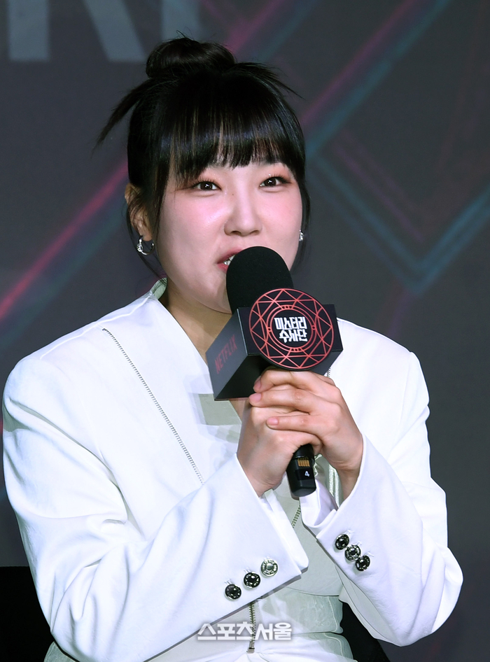 개그우먼 이은지가 18일 서울 마포구 호텔 나루 서울 엠갤러리에서 진행된 넷플릭스 ‘미스터리 수사단’ 제작발표회에서 사회자의 질문에 답을 하고 있다.