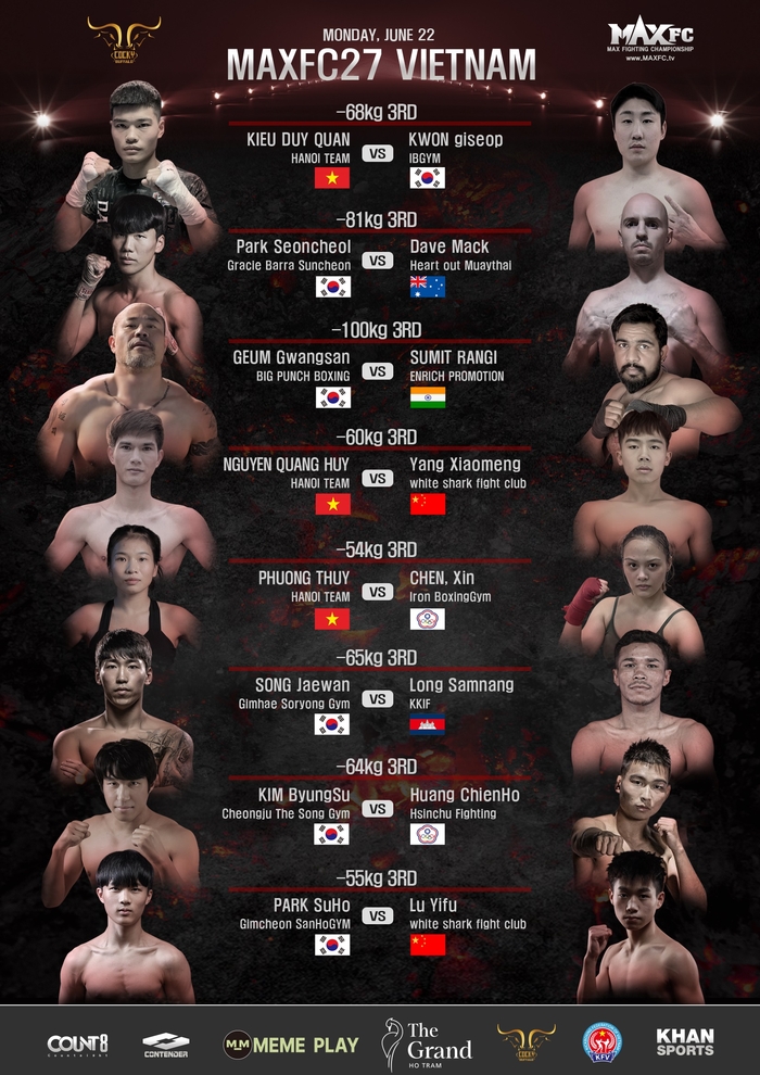 이번 대회에도 한국, 중국, 인도, 대만, 베트남, 호주, 캄보디아의 총 7개국의 정상급 선수들이 총 출동해 볼거리가 풍성할 것으로 기대되고 있다. 이번 ‘MAXFC 27 IN 베트남’은 베트남 붕따우 더그랜드호트램 특설링에서 진행되며, 유튜브 채널 MAXFC에서 생중계된다.