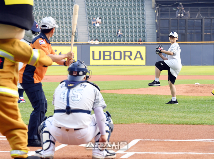 ‘두산 소방가족의 날’을 맞아 순직소방관 고 김범석 소방장의 아들 김예준 군이 19일 잠실구장에서 열린 2024 KBO리그 두산 베어스와 NC 다이노스의 경기에 앞서 시구를 하고 있다. 시타는 김범석 소방장의 동료인 한정민 서울119 특수구조단 팀장이 맡았다. 2024. 6. 19.