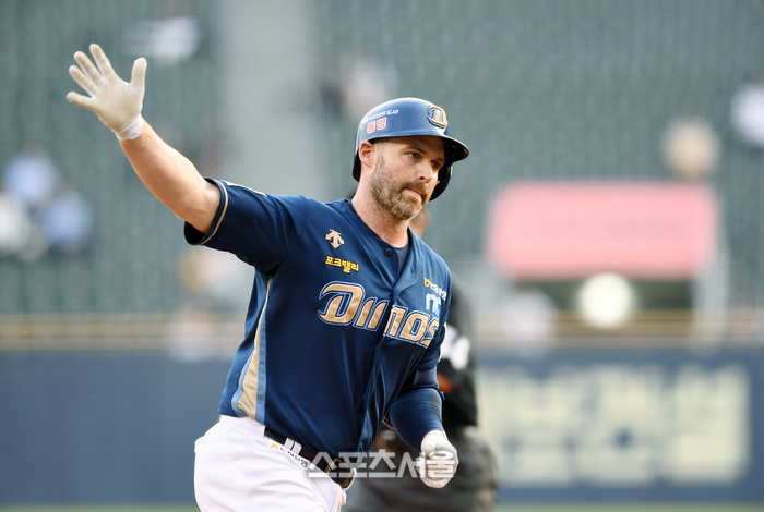 NC 다이노스 데이비슨이 19일 잠실구장에서 열린 2024 KBO리그 두산 베어스와 경기 2회초 무사 두산 선발 최원준을 상대로 솔로 홈런을 치고 이종욱 코치와 하이파이브를 하고 있다. 데이비슨의 시즌 21호 홈런. 2024. 6. 19.