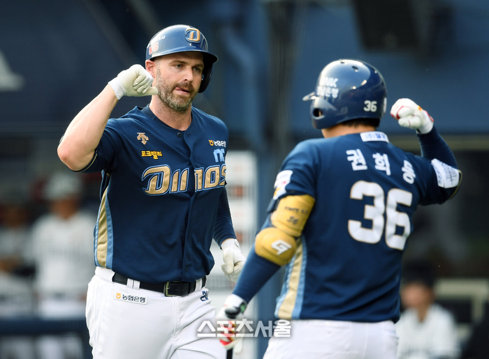 NC 다이노스 데이비슨이 19일 잠실구장에서 열린 2024 KBO리그 두산 베어스와 경기 2회초 무사 두산 선발 최원준을 상대로 솔로 홈런을 치고 권희동과 하이파이브를 하고 있다. 데이비슨의 시즌 21호 홈런. 2024. 6. 19.