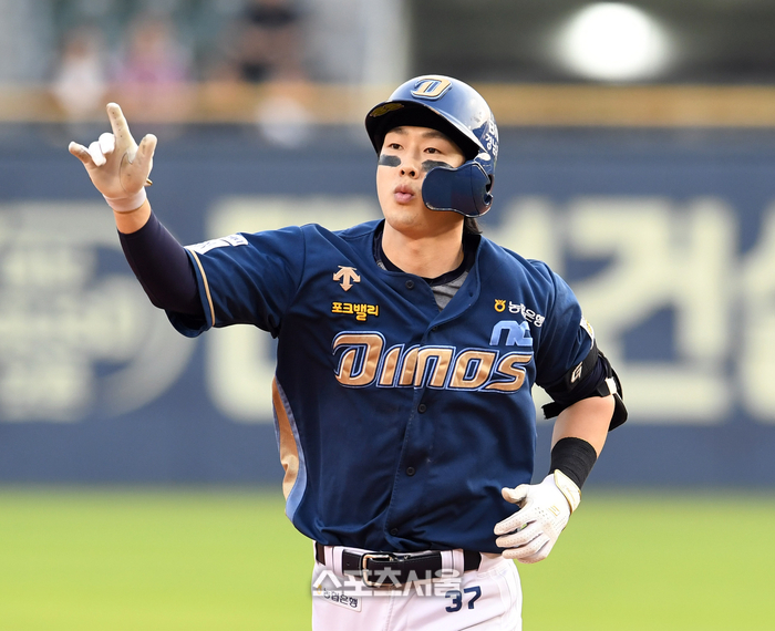 NC 다이노스 박건우가 19일 잠실구장에서 열린 2024 KBO리그 두산 베어스와 경기 3회초 2사 2루 상황에서 두산 선발 최원준을 상대로 2점 홈런을 치고 기뻐하고 있다. 박건우의 시즌 7호 홈런. 2024. 6. 19.