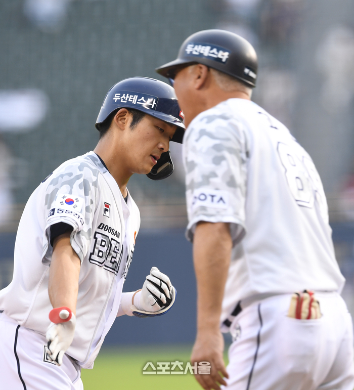 두산 베어스 김대한이 19일 잠실구장에서 열린 2024 KBO리그 NC 다이노스와 경기에서 NC 선발투수 카스타노를 상대로 솔로 홈런을 친 뒤 고토 코치와 하이파이브를 하고 있다. 김대한의 시즌 1호 홈런. 2024. 6. 19.