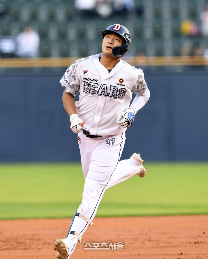 두산 베어스 김대한이 19일 잠실구장에서 열린 2024 KBO리그 NC 다이노스와 경기에서 NC 선발투수 카스타노를 상대로 솔로 홈런을 친 뒤 베이스를 돌고 있다. 김대한의 시즌 1호 홈런. 2024. 6. 19.