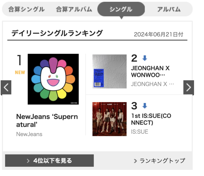 23일 일본 오리콘 차트에 따르면 데일리 뉴진스 일본 데뷔 싱글 ‘슈퍼내추럴’은 오리콘 최신 차트에서 데일리 싱글 랭킹 정상에 올랐다. 발매 당일 한터차트와 오리콘차트를 모두 석권하며 존재감을 드러내고 있다.