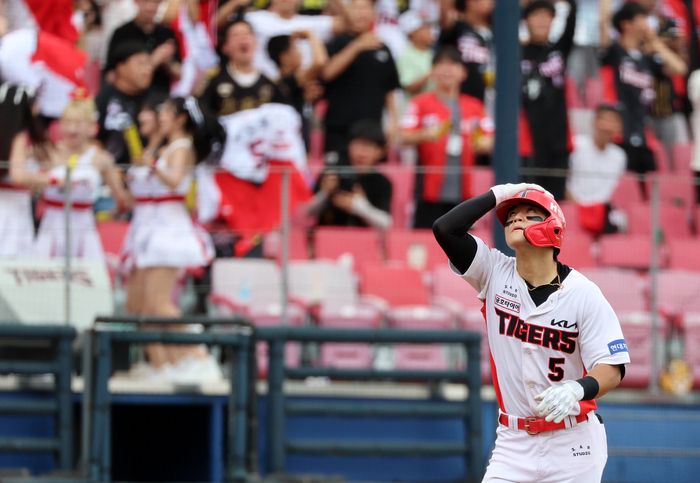 김도영은 23일 광주-기아 챔피언스 필드에서 열린 2024 KBO리그 한화와 더블헤더 1차전에서 0-5로 뒤진 4회말 좌중간 담장을 넘기는 솔로 아치를 그렸다.