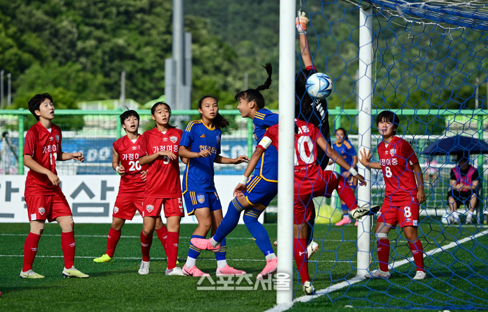 23일 경남 합천군 군민체육공원에서 진행된 ‘2024 스포츠 명품도시 웰니스 합천에서 펼쳐지는 제23회 여왕기 전국여자축구대회’ 중등부 현대청운중과 가정여중의 8강 경기에서 현대청운중의 킥이 골라인을 통과하고 있다. 현대청운중의 골키퍼 차징 반칙으로 골이 되진 않았다. 2024. 6. 23.