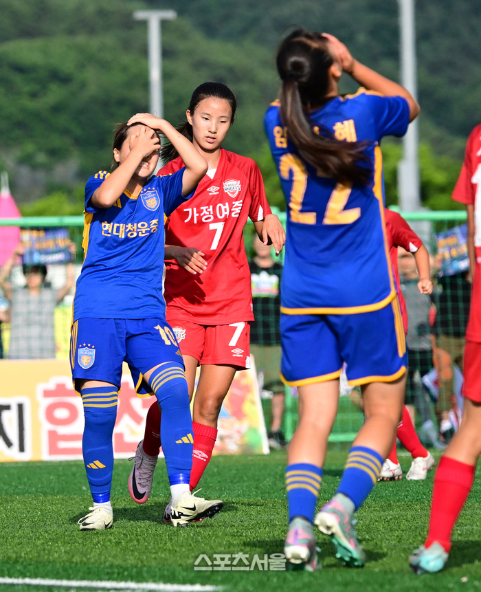 23일 경남 합천군 군민체육공원에서 진행된 ‘2024 스포츠 명품도시 웰니스 합천에서 펼쳐지는 제23회 여왕기 전국여자축구대회’ 중등부 현대청운중과 가정여중의 8강 경기에서 슛을 시도했던 현대청운중 한국희(왼쪽)와 크로스를 한 임지혜가 빗나간 슛에 함께 아쉬워하고 있다. 2024. 6. 23.