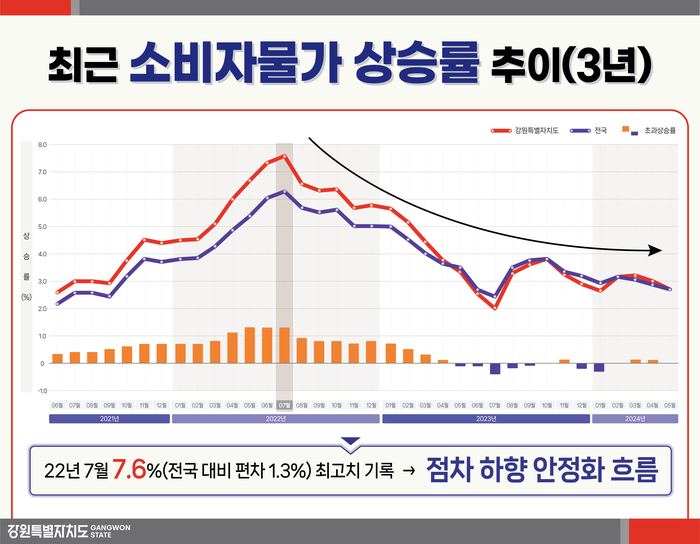 지난 3년간 소비자 물가상승률을 분석한 결과 도는 2022년 7월 상승률 7.3%, 전국 상승률과의 편차 1.3%로 가장 고점을 기록한 이후 점차 하락해 3% 내외에서 등락을 반복하고 있다.