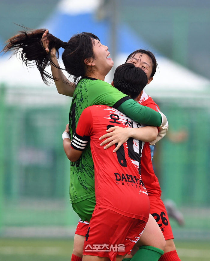 24일 경남 합천군 군민체육공원에서 진행된 ‘2024 스포츠 명품도시 웰니스 합천에서 펼쳐지는 제32회 여왕기 전국여자축구대회’ 대학부 울산과학대와 경북 대경대의 준결승 경기에서 대경대 골키퍼 홍유진(왼쪽)이 승부차기 선방으로 팀을 결승으로 이끈 뒤 동료들과 함께 기뻐하고 있다. 2024. 6. 24.