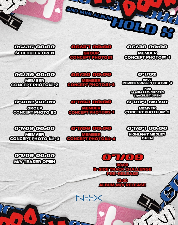 그룹 엔티엑스(형진, 윤혁, 재민, 창훈, 호준, 로현, 은호, 승원)는 25일 자정 공식 SNS를 통해 두 번째 미니앨범 ‘HOLD X(홀드 엑스)’의 스케줄러를 깜짝 공개하고 7월 컴백을 예고했다.