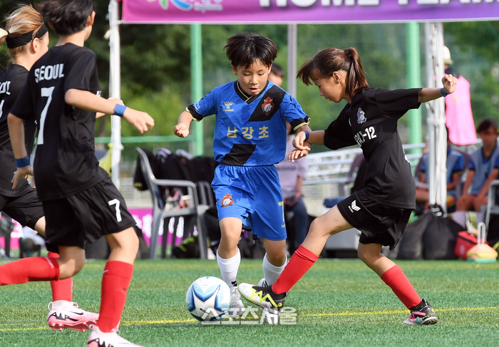 25일 경남 합천군 군민체육공원에서 진행된 ‘2024 스포츠 명품도시 웰니스 합천에서 펼쳐지는 제32회 여왕기 전국여자축구대회’ 초등부 경남 남강초와 서울 우이초의 결승전에서 남강초 정재희(가운데)가 드리블 돌파를 하고 있다. 2024. 6. 25.
