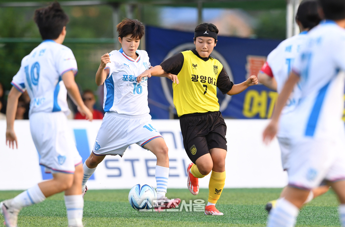 25일 경남 합천군 군민체육공원에서 진행된 ‘2024 스포츠 명품도시 웰니스 합천에서 펼쳐지는 제32회 여왕기 전국여자축구대회’ 고등부 전남 광양여고와 경북 포항여전고의 준결승전에서 포항여전고 이시온(왼쪽)과 광양여고 정지원이 볼을 다투고 있다. 2024. 6. 25.