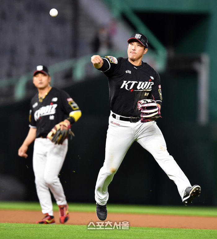 KT 3루수 황재균이 25일 인천SSG랜더스필드에서 열린 2024 프로야구 SSG랜더스와 KT위즈의 경기 8회말 2사 2,3루 SSG 2번타자 오태곤의 타구를 잡아 1루로 송구하고 있다. 2024.06.25.