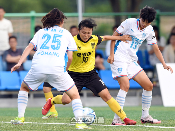 25일 경남 합천군 군민체육공원에서 진행된 ‘2024 스포츠 명품도시 웰니스 합천에서 펼쳐지는 제32회 여왕기 전국여자축구대회’ 고등부 전남 광양여고와 경북 포항여전고의 준결승전에서 광양여고 조혜영(가운데)이 돌파를 시도하고 있다. 2024. 6. 25.
