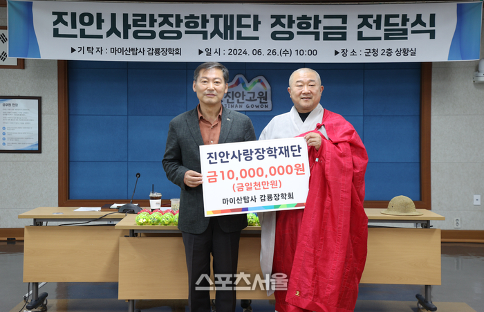 [스포츠서울 ㅣ 진안=고봉석 기자] 전북 진안군 마이산탑사 갑룡장학회(이사장 진성)는 26일 진안군청 상황실에서 진안사랑장학재단(이사장 전춘성)에 장학금 1,000만원을 기탁했다고 밝혔다.
