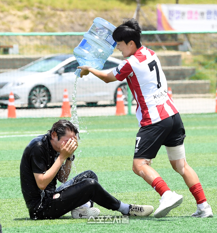고려대 박지승 코치가 26일 경남 합천군 군민체육공원에서 진행된 ‘2024 스포츠 명품도시 웰니스 합천에서 펼쳐지는 제32회 여왕기 전국여자축구대회’ 대학부 시상식에서 최우수코치상을 받은 뒤 서현민의 축하 물세례를 맞고 있다. 2024. 6. 26.