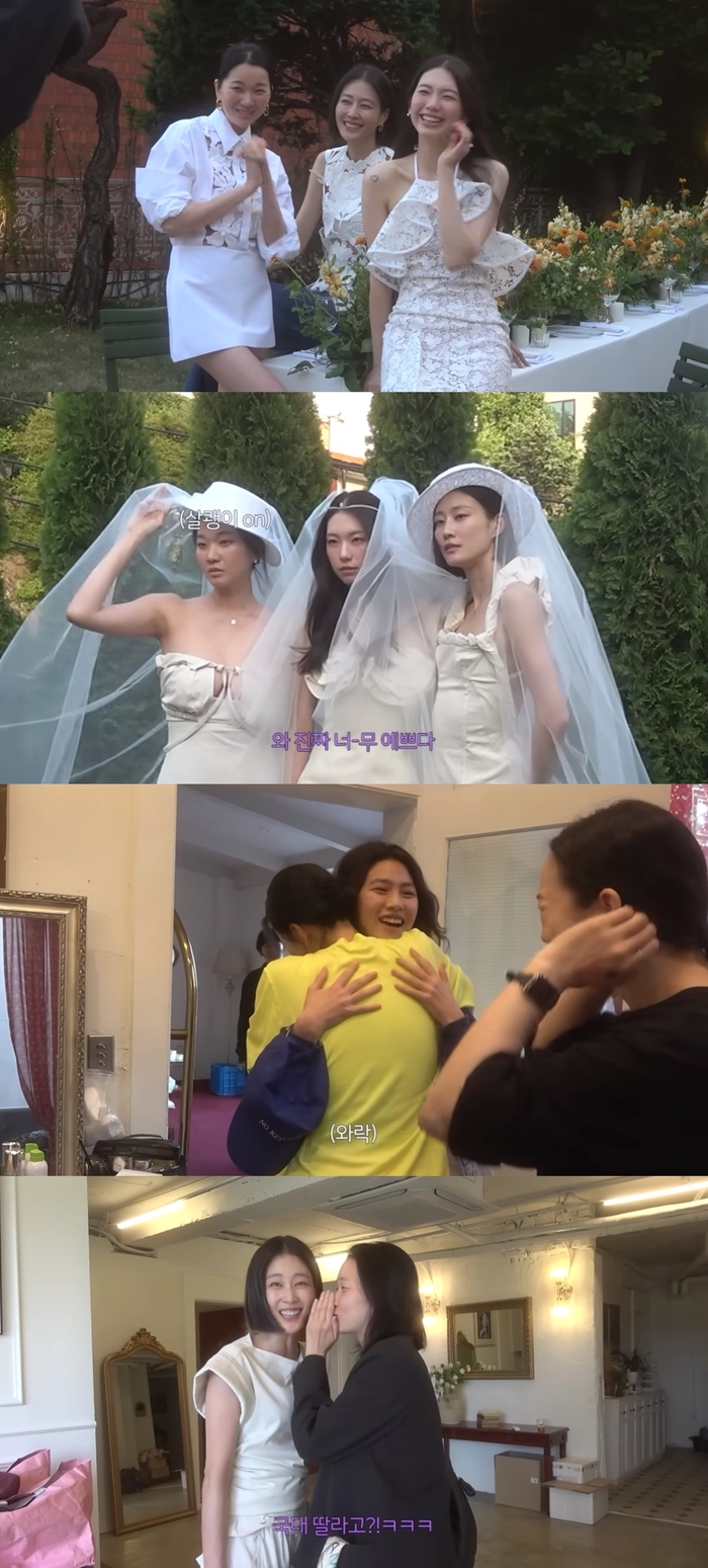 장윤주는 26일 자신의 유튜브 채널 ‘윤쥬르’에 김진경 김승규의 웨딩화보 촬영 현장을 공개했다. 이날 이현이와 함께 현장을 찾은 장윤주는 신부 김진경과 들러리 화보를 촬영했다.