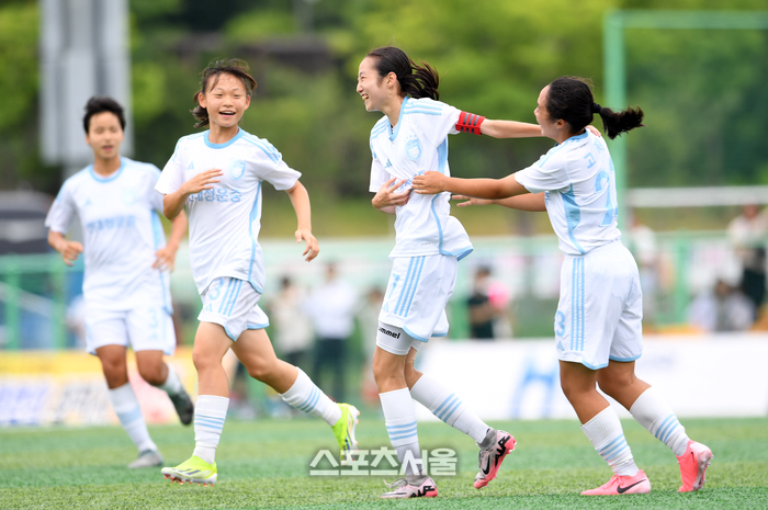울산 현대청운중 추지연(오른쪽 둘째)이 27일 경남 합천군 군민체육공원에서 진행된 ‘2024 스포츠 명품도시 웰니스 합천에서 펼쳐지는 제32회 여왕기 전국여자축구대회’ 중등부 충북 예성여중과 결승전에서 팀의 세 번째골을 넣고 동료들과 함께 기뻐하고 있다. 2024. 6. 27.