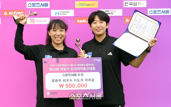 울산 현대청운중 이유연 코치(왼쪽)과 김덕유 코치가 27일 경남 합천군 군민체육공원에서 진행된 ‘2024 스포츠 명품도시 웰니스 합천에서 펼쳐지는 제32회 여왕기 전국여자축구대회’ 중등부 충북 예성여중과 결승전에서 승리해 우승을 차지한 뒤 최우수코치상을 수상하고 기념촬영을 하고 있다. 2024. 6. 27.