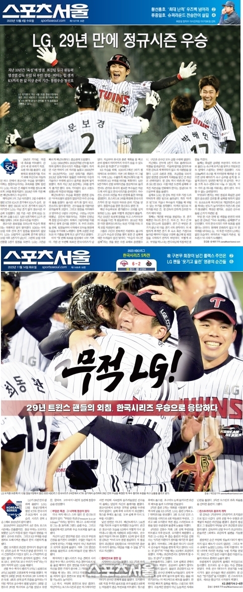 사양산업으로 평가받던 스포츠 신문의 굿즈(Goods)화 가능성을 연 기념비적인 날로, 한국시리즈 패권까지 차지해 29년 만의 통합우승을 이룬 2023년 11월14일 신문마저 ‘품절 대란’을 일으켰다.