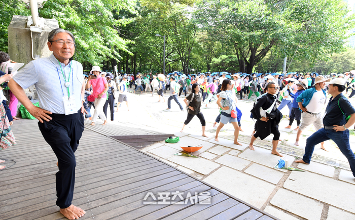 맨발걷기국민운동본부 박동창 회장이 29일 서울 성동구 서울숲 가족마당에서 진행된 ‘제1회 서울 K-맨발걷기 페스티벌’을 시작하면서 참가자들과 함께 준비운동을 하고 있다.