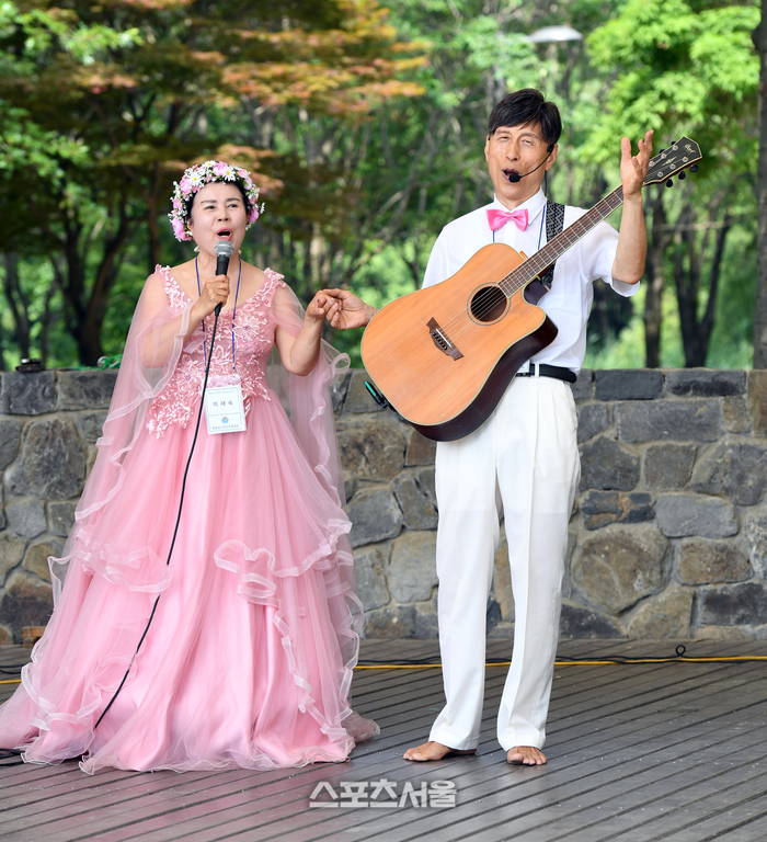 ‘사랑의 듀엣’ 남양우(오른쪽)-이재숙 부부가 29일 서울 성동구 서울숲 가족마당에서 진행된 ‘제1회 서울 K-맨발걷기 페스티벌’에서 축하 공연을 하고 있다.