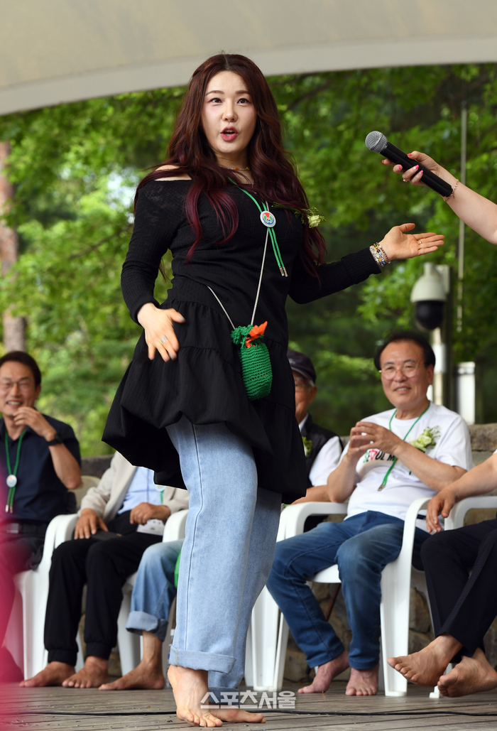 가수 길건이 29일 서울 성동구 서울숲 가족마당에서 진행된 ‘제1회 서울 K-맨발걷기 페스티벌’에서 참가자들과 함께 할 안무를 소개하고 있다. 길건은 행사의 홍보대사를 맡았다.
