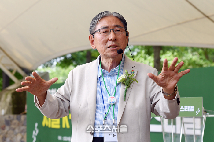 맨발걷기국민운동본부 박동창 회장이 29일 서울 성동구 서울숲 가족마당에서 진행된 ‘제1회 서울 K-맨발걷기 페스티벌’에서 특강을 하고 있다.