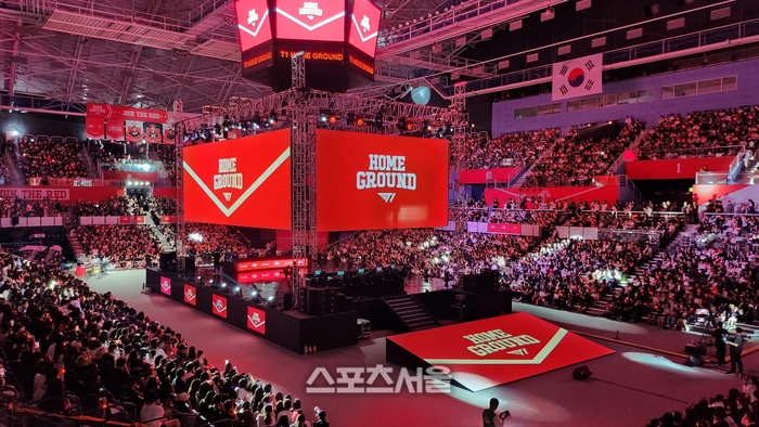 ‘T1 홈 그라운드’는 지난달 29일 경기도 고양시에 있는 소노아레나에서 열렸다. LCK 서머 정규리그 최초로 별도 경기장에서 T1 홈 경기로 치러졌다. 2021년 LCK 프랜차이즈 도입 이후 첫 시도다.