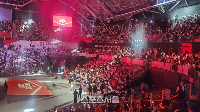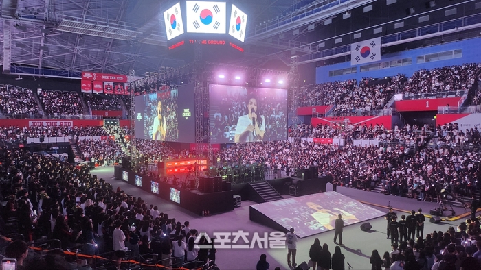 결과보다 ‘T1 홈 그라운드’가 보여준 새로운 가능성에 더 주목할 필요가 있다. 이날 행사에는 약 7000명의 팬과 함께 했다. 전 좌석 매진. 여기에 프로야구 등 정통 스포츠에서나 볼 수 있었던 치어리더 공연, 선수별 응원가와 다양한 이벤트가 한데 어우러졌다. 카드 섹션, 대형 천막 등 A매치(국가대표)에서나 나올 법한 퍼포먼스로 열띤 응원전이 펼쳐졌다. T1은 하이브와 함께 제작한 LED 응원 팔찌로 변화무쌍한 화려한 응원을 펼치기도 했다.