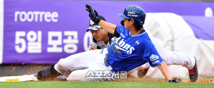 삼성 3번타자 구자욱이 30일 수원KT위즈파크에서 열리는 2024 프로야구 KT위즈와 삼성라이온즈 더블헤더 1차전 6회초 2사후 좌중간 2루타를 날리고 중계플레이가 빠르지않음을 확인하고 3루까지 내달려 세이프됐다. 태그가 빨랐음을 확신한 KT 3루수 황재균의 비디오판독 요청 사인이 있었고 판정은 세이프에서 아웃으로 번복됐다.2024.06.30.